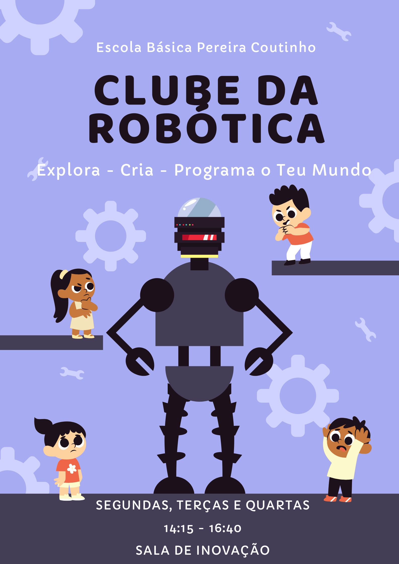 Clube de Robótica na Escola Básica de Cascais. As sessões decorrem às segundas, terças e quartas-feiras, entre as 14h15 e as 16h40. As inscrições devem ser feitas no PBX.